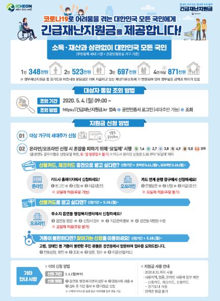 정부 긴급재난지원금은 기 지급된 경기도 및 이천시 긴급재난기본소득 일부를 제외한 1인 34만8천원, 2인 52만3천원, 3인 69만7천원, 4인 이상 87만1천원이 지원되며, 지원금은8월 31일까지 사용이 가능하고, 사용잔액은 환급되지 않는다.