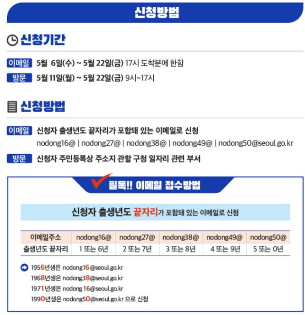 신청 기간은 이메일 접수의 경우 5월 6일~22일 오후 5시까지이며, 방문 접수의 경우 5월 11일~22일 오후 5시까지다.