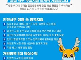 정부 및 인천시 지침과 연계해 서구는 지역 환경에 적합한 생활 속 거리두기 방침을 마련하고 6일부터 실행에 옮기기로 했다. 특히 재유행 가능성을 항상 염두에 두고 이전보다 한층 철저한 방역 및 관리를 병행해갈 방침이다.