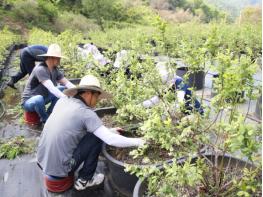 이날 봉사에 참여한 직원들은 꽃눈 솎기, 전지목 줍기, 고추심기, 제초작업 등의 활동을 펼치며 코로나19로 인해 침체한 지역 농업 살리기에 힘을 보태는 모습을 보였다.
