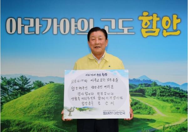 조 군수는 손수 적은 희망의 문구를 손에 들고 “우리가 여러 어려움 속에서도 희망을 만날 수 있었던 건 코로나19와 싸우고 있는 모든 분들과 함안군민 여러분 덕분이다. 힘든 시기를 지나왔지만 앞으로도 생활 속 거리두기를 함께 실천해 위기를 반드시 극복하자”며 함안군민뿐만 아니라 전 국민에게 응원의 메시지를 전했다.