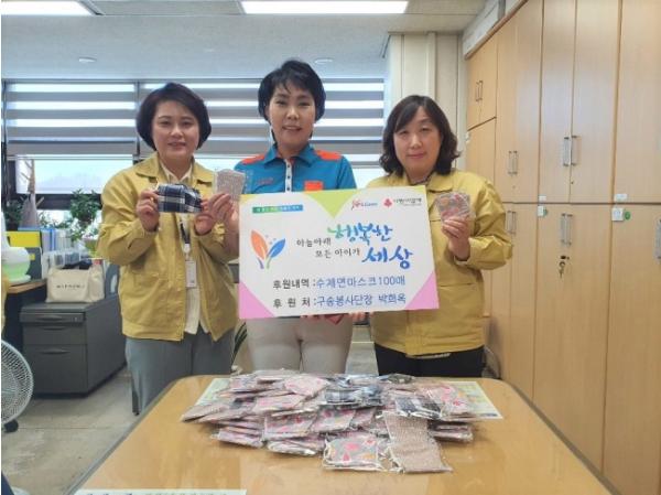 구미시(시장 장세용)는 7일 아동용 수제 면마스크 100매(50만원 상당)를 박희옥(54, 여)씨로부터 후원 받았다.
