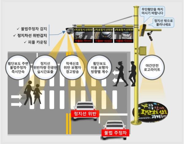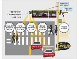 횡단보도에 지능형 CCTV와 LED 전광판을 설치해 횡단보도 주변 불법주정차 차 량에 대해서는 실시간으로 감지하여 자동으로 과태료까지 부과하고, 횡단보도 정 지선 위반 차량은 차량번호를 전방에 설치된 전광판에 표출하여 어린이보호구역 에서의 교통안전에 경각심을 유도한다.