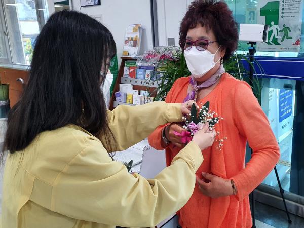 무주읍행정복지센터 직원들이 달아주는 카네이션을 가슴에 단 주민들은 “볼 일 보러 왔다가 뜻밖의 꽃을 받으니 좋다”라며 “코로나 때문에 애들도 오지 말라고 했는데 큰 위로가 된다”라고 전했다.