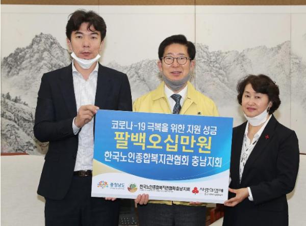 충남도는 8일 도청 접견실에서 한국노인종합복지관협회 충남지회로부터 코로나19 극복 성금 850만 원을 전달 받았다고 밝혔다.