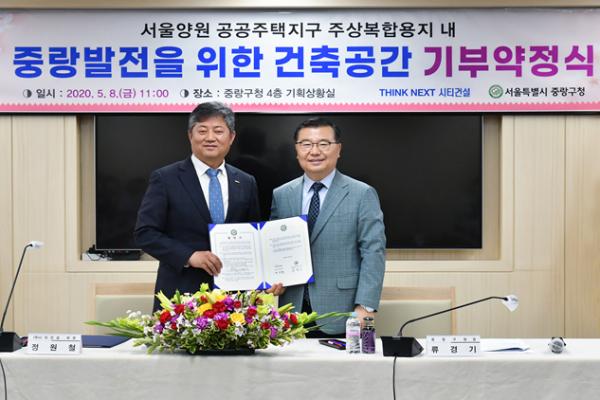 류경기 중랑구청장은 “중랑구민들의 생활향상과 공공서비스 강화를 위해 조건 없이 기부해주셔서 감사하다”며, “기부 받은 건축공간은 양원지구 및 신내공공주택지구 주변 주민들의 부족한 생활 인프라 지원 및 지역 주민들의 생활편익 증진을 위해 사용하겠다”고 말했다.