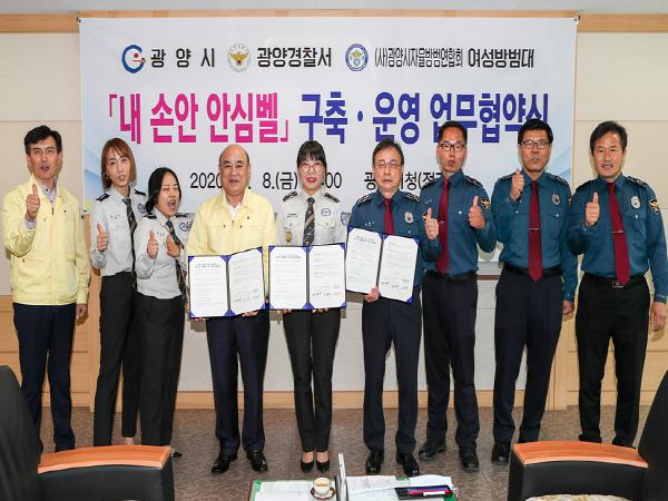 이번 업무협약은 행정안전부의 ‘2020년 디지털 지역혁신 활성화’ 공모사업에서 ‘내 손안 안심벨’이 지난 4월 최종 선정되어 광양시와 광양경찰서, 광양시 자율방범연합회 여성방범대 간 협업체계 구축과 성공적인 사업추진을 위해 마련됐다.