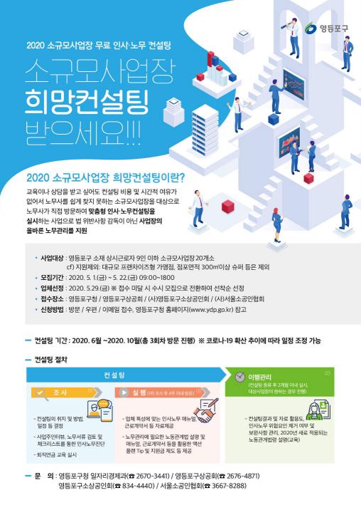 영등포구(구청장 채현일)가 소규모 사업장을 대상으로 노무사가 직접 찾아가는 인사?노무 컨설팅을 무료 지원한다.