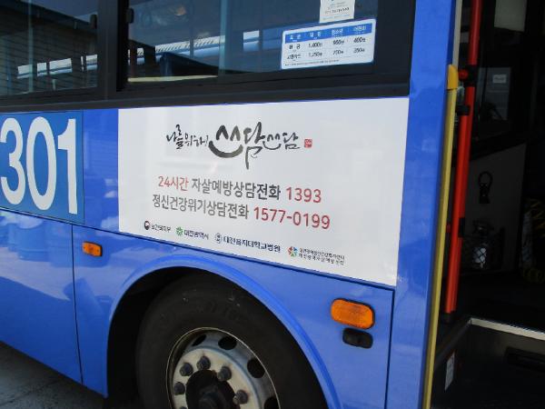 대전광역자살예방센터는 일상생활에서 자주 접하고 쉽게 이용할 수 있는 지역 내 시내버스 35대를 활용해 생명존중 감성문구와 함께 정신건강에 어려움이 있는 사람들이 24시간 도움을 요청할 수 있는 자살예방상담전화 1393, 정신건강위기상담전화 1577-0199 홍보에 나섰다.