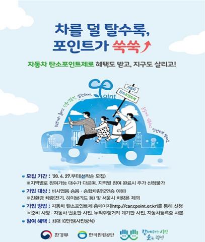 참여를 희망하는 시민은 자동차 탄소포인트제 누리집(http://car.cpoint.or.kr)에서 회원가입 후 자동차 번호판 사진, 누적 주행거리 계기판 사진, 자동차 등록증 사본을 제출해 신청하면 된다.