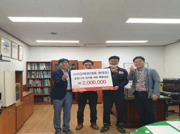 남양주시(시장 조광한)는 지난 8일 ㈜미건에코(대표 송대성)에서 코로나19 피해 지원을 위한 후원금 200만원을 경기사회복지공동모금회에 전달했다고 밝혔다.