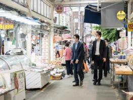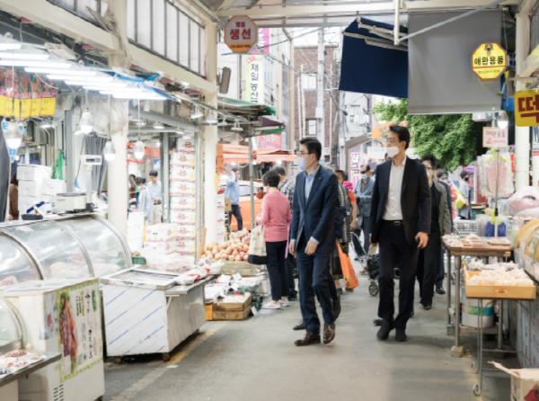 이정훈 강동구청장이 5월 8일(금) 오후 명일전통시장 어닝 정비사업 완료에 따라 현장을 방문해 시장상인들을 만났다. 이번 3차 구간 어닝 사업은 명일동 326-11에서 염주골 공원 일원 약 63m구간으로 아치형 스카이어닝으로 추진됐다.