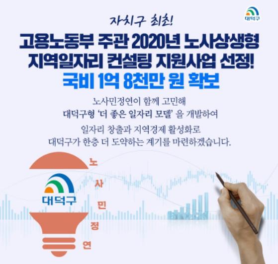 대전 대덕구(구청장 박정현)가 고용노동부 산하 노사발전재단이 공모한 ‘2020년 노사상생형 지역일자리 컨설팅지원 사업’에 전국 자치구 최초로 선정돼 국비 1억8천만 원을 확보했다.