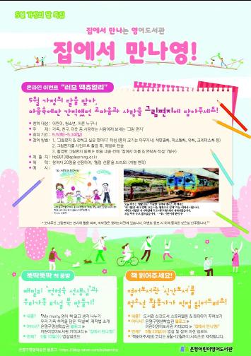 은평구평생학습관내 위치한 은평어린이영어도서관에서는 5월 가정의 달을 맞이하여 코로나19로 도서관을 방문하지 못하는 주민들의 독서 및 독후 활동을 독려하고자 ‘집에서 만나영!(집에서 만나는 영어도서관)’온라인 학습을 운영한다.