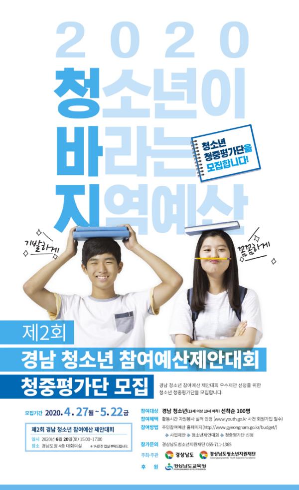 경상남도와 경상남도청소년지원재단이 주최·주관하는 ‘제2회 경남 청소년 참여예산 제안대회’ 본선 우수제안팀 선정에 참여할 청소년 청중평가단 100명을 5월 22(금)까지 모집한다.