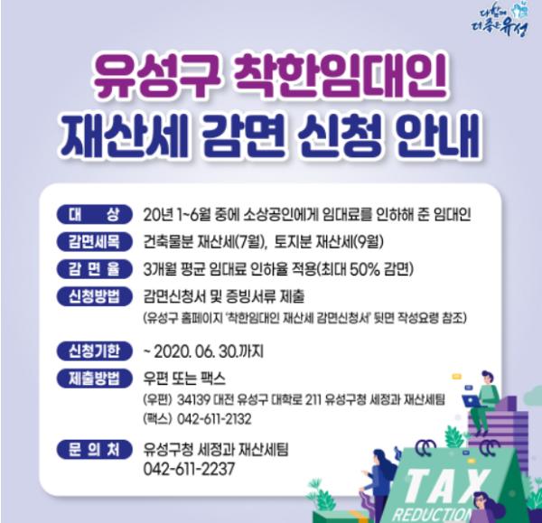 신청서는 유성구 홈페이지(www.yuseong.go.kr)에서 받을 수 있으며 임대차 계약서, 세금계산서 등 임대료 인하를 확인할 수 있는 서류, 임차인의 소상공인 확인서 등을 함께 구비하여 6월 30일까지 유성구 세정과 재산세팀에 제출하면 된다.