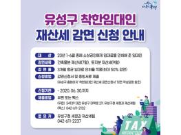 대전 유성구(구청장 정용래)는 오는 13일부터 소상공인에게 임대료를 인하해 준 착한 임대인(건물주)을 대상으로 재산세 감면 신청을 받는다고 밝혔다.