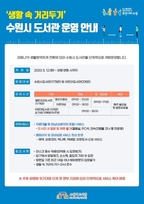 수원시도서관은 감염병 위기 대응 단계·정부 지침에 따라 단계적으로 운영 서비스를 확대할 예정이다.