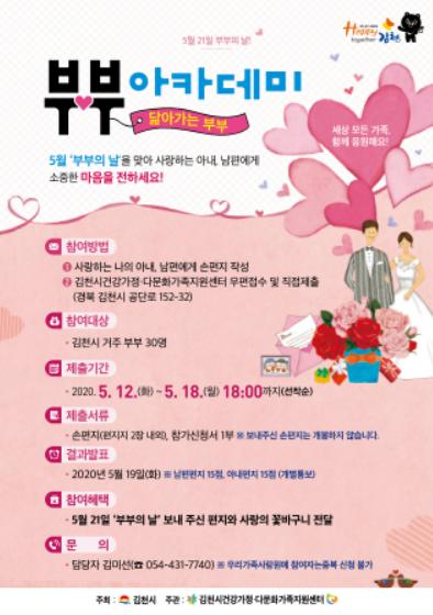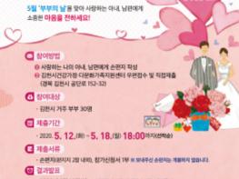 5월 12일부터 19일까지 진행하는 이번 이벤트는 김천시에 거주하는 부부는 누구나 신청 가능하며, 손편지와 참가신청서를 건강가정다문화가족지원센터로 우편 또는 직접 방문하여 제출하면 된다. 아내편지 15명, 남편편지 15명 총 30명을 선착순 접수 받아, 부부의 날에 손편지와 꽃다발을 함께 퀵서비스로 전달할 예정이다.