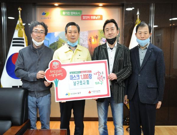 대구광역시 남구청(구청장 조재구)에서는 지난 2일, 대구 남구의사회(회장 정의달)에서 코로나19 예방 및 확산방지를 위해 사용해달라며 마스크 1,000장을 전달하였다고 밝혔다.
