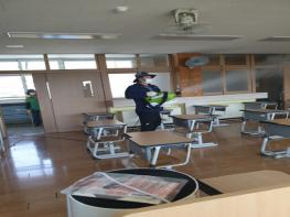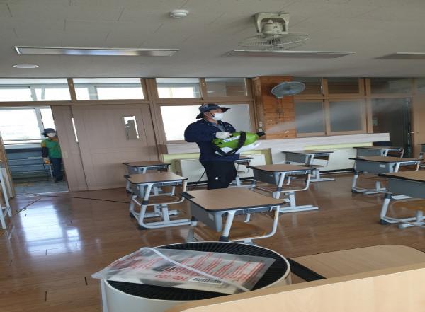 새마을회는 각 읍?면에 자체 소독조를 편성하여 학교 진입로 및 체육시설, 출입문 손잡이, 복도 등 각종 학교시설물을 소독하고 아이들이 자주 생활하는 교실의 집중 소독을 진행하였다.