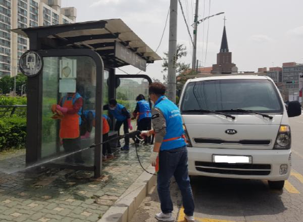 이날 봉사활동에 참가한 협의체 회원들은 고압살수기를 이용하여 신건지동 버스정류장부터 대우아파트 정류장까지 주민들이 많이 이용하는 정류장의 묵은 먼지와 때를 깔끔이 물청소 했다.