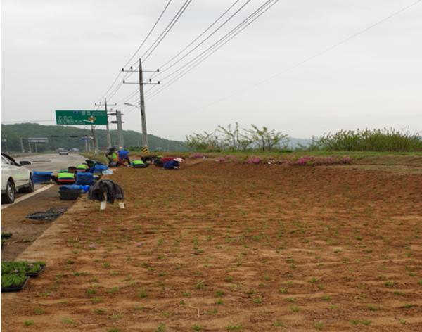 연천군 미산면 주민자치위원회(위원장 유주애) 및 부녀회(회장 박원례)에서는 도로변 유휴지(황공천 제방) 사면을 활용한 꽃길조성을 하기 위해 지난 12일 새벽부터 30여 명이 참석하여 꽃 잔디 40,000본을 0.55km 구간에 심었다고 밝혔다.