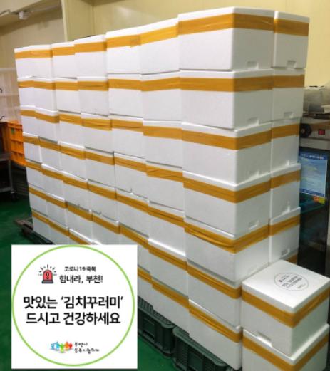 부천시 동 복지협의체에서 지난 12일 관내 코로나19 피해를 입은 위기가구에 캔 김치 6종 세트로 구성된 김치 꾸러미 총 100박스를 전달했다.