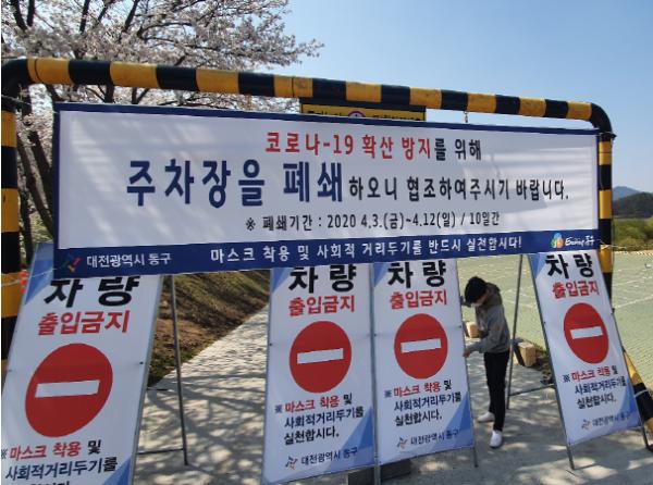 대전 동구(구청장 황인호)는 코로나19 확산방지를 위한 사회적 거리두기의 일환으로 대청호 벚꽃길 주차장을 폐쇄한다.