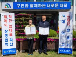 대전 대덕구(구청장 박정현)가 13일 구청에서 코로나19로 인한 소상공인 고통분담을 위해 신탄진동에 거주하는 정윤기 씨와 착한 임대료 확산 릴레이 상생협약을 맺었다.