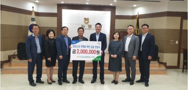수동농협(조합장 류재성)은 지난 12일 수동면(면장 문만수)을 방문해 코로나19 극복을 위한 ‘남양주시 전 시민 서로 버팀목 되어주기(Thank You! 착한 기부) 캠페인’에 동참해 성금 200만원을 경기사회복지공동모금회에 지정 기탁했다.