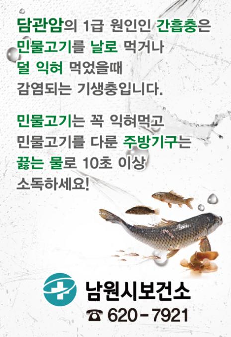 남원시보건소가 남원시민을 대상으로 실시한 장내기생충 검사에서 세계보건기구(WHO)가 담관암의 1급 원인으로 규정하고 있는 간흡충 양성률이 4.6%에 이르러 민물고기 생식에 주의가 요구되고 있다.