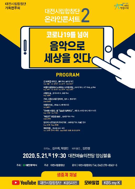 온라인 콘서트 2 코로나 19를 넘어‘음악으로 세상을 잇다’는 유튜브 대전시립합창단, KBS대전 채널과 KBS의 모바일 앱 my K를 통해 감상할 수 있다.