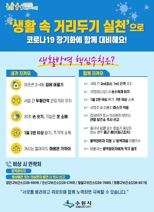 수원시는 위생 관련 단체와 협력체계를 구축해 세부 지침을 집중적으로 홍보하고 있다. 또 소비자식품·명예공중위생감시원을 활용해 현장에서 지침 이행 준수 여부를 점검하고, 생활방역지침을 안내하고 있다.