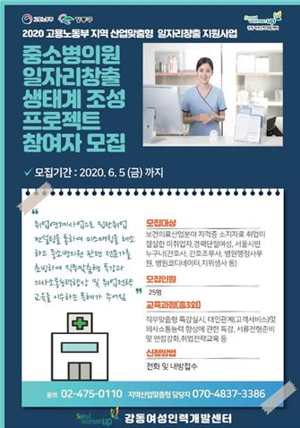 강동구(구청장 이정훈)는 2020 지역산업 맞춤형 일자리창출 지원 사업으로 『경력단절여성 취업연계 중소병의원 일자리창출 생태계 조성 프로젝트』를 진행한다. 사업은 ‘강동여성인력개발센터’에서 맡는다.
