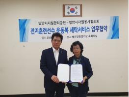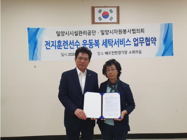 밀양시시설관리공단과 (사)밀양시자원봉사단체협의회(회장 손제란)는 13일 배드민턴경기장 전지훈련 활성화를 위해 운동복 세탁 서비스 업무협약을 체결했다.
