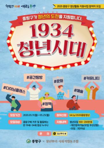 서울특별시 중랑구(구청장 류경기)가 지역 청년들의 도전을 지원하고 폭넓은 경험을 제공하기 위해 나섰다. 구는 오는 25일까지 ‘1934 청년시대’ 참여자를 모집해 최대 200만원까지 지원한다.
