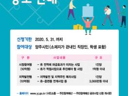 공모사업 규모는 시정참여형 10억원, 지역발전형 10억원을 합해 총 20억원이며 양주시에 거주하는 시민, 직장인, 학생이면 누구나 제안할 수 있다.