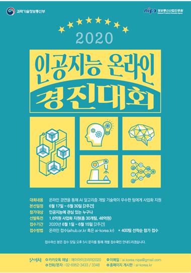 과학기술정보통신부(장관 최기영)는 온라인상에서 인공지능(AI) 알고리즘 개발 능력을 경연하는「2020 인공지능(AI) 온라인 경진대회」를 개최한다고 밝혔다.