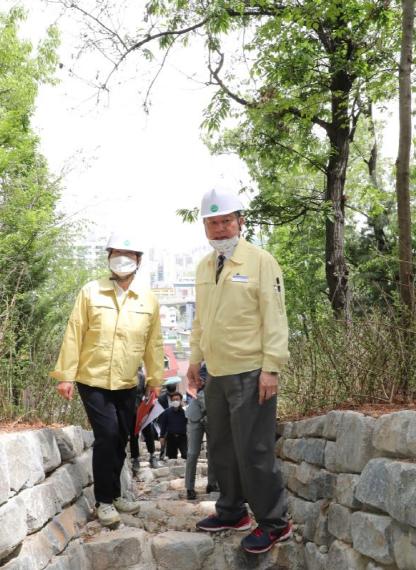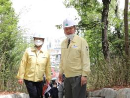 유동균 마포구청장이 14일(목) 오전, 여름철 풍수해 등으로 발생할 수 있는 산사태 위험 지역 대비 현황을 확인하고 애로사항을 청취하기 위해 직접 성미산 산사태 예방 공사현장을 찾았다.