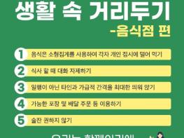 또한, 음식점 운영자에게는 ▲업소 내 방역책임자 지정·운영, ▲마스크 착용 등 종사자 교육 철저, ▲탁자 사이 간격 2m(최소 1m) 두기, ▲덜어먹을 수 있는 개인접시 및 집게 제공하기 등을 안내했다.