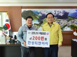 봉화군 한성티앤아이(대표 정윤상)는 3월 31일(화) 봉화군청을 방문하여 코로나19 극복을 위한 특별성금 각각 200만원을 기탁했다.