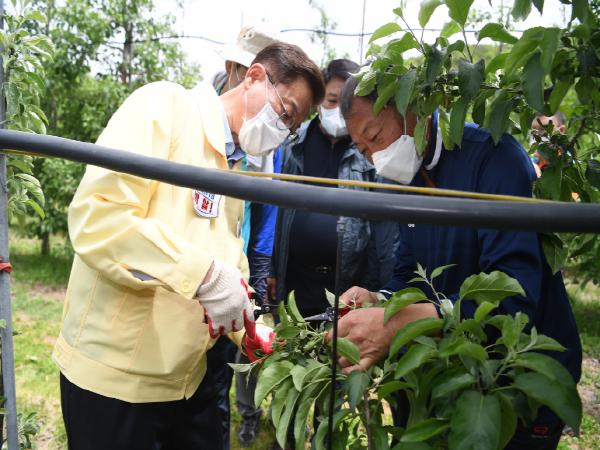이튿날인 14일에는 과수농가와 광역학교급식센터를 찾았다. 먼저, 이 날 오전에는 의성군 옥산면 소재 과수농가에 들러 경북지역에 일손지 원을 나온 농림축산식품부 관계자들에게 고마움을 표하고 사과적과 작업도 함께하며 작으나마 일손을 보탰다.