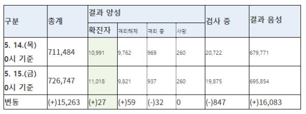 질병관리본부 중앙방역대책본부(본부장 정은경)는 5월 15일 0시 현재, 신규 확진자가 27명 발생하여 총 누적 확진자수는 11,018명(해외유입 1,150명(내국인 89.8%))이라고 밝혔다. 신규 격리해제자는 59명으로 총 9,821명(89.1%)이 격리해제 되어, 현재 937명이 격리 중이다