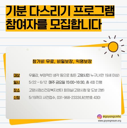 고양시정신건강복지센터(이하 센터)는 우울감이나 스트레스 등으로 어려움을 겪는 고양시민을 대상으로 ‘기분 다스리기 프로그램’ 참여자를 19일까지 모집한다고 밝혔다.