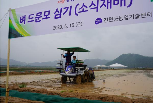 진천군 농업기술센터는 15일 문백면 장월리에서 드문모심기 이앙 시연회를 개최했다.