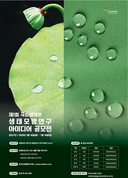환경부 산하 국립생태원(원장 박용목)은 생태모방관련 연구 아이디어 발굴 및 생태모방에 관한 국민의 관심을 높이기 위해 '제1회 국립생태원 생태모방 아이디어 공모전'을 5월 18일부터 7월 10일까지 개최한다.