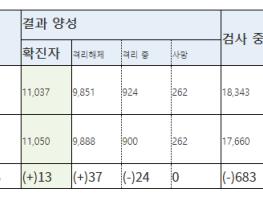 질병관리본부 중앙방역대책본부(본부장 정은경)는 5월 17일 0시 현재, 신규 확진자가 13명 발생하여 총 누적 확진자수는 11,050명(해외유입 1,167명(내국인 89.2%))이라고 밝혔다. 신규 격리해제자는 37명으로 총 9,888명(89.5%)이 격리해제 되어, 현재 900명이 격리 중이다.
