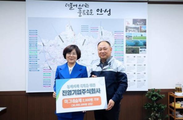 이번 기증물품은 진영기업주식회사에서 안성시에 마그네슘제(스타보린1호) 2,000병, 안성원예농협에 2,400병을 기증 하였으며, 시가 6천4백만 원 상당인 것으로 알려졌다.