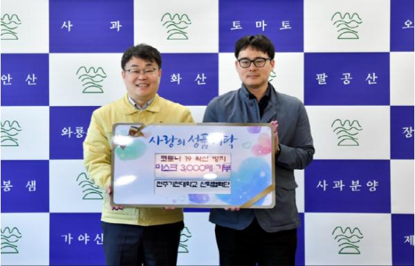 전주기전대학교 산학협력단은 코로나19 확산 방지를 위하여 3일 장수군에 3백만원 상당의 긴급구호 물품을 전달했다.